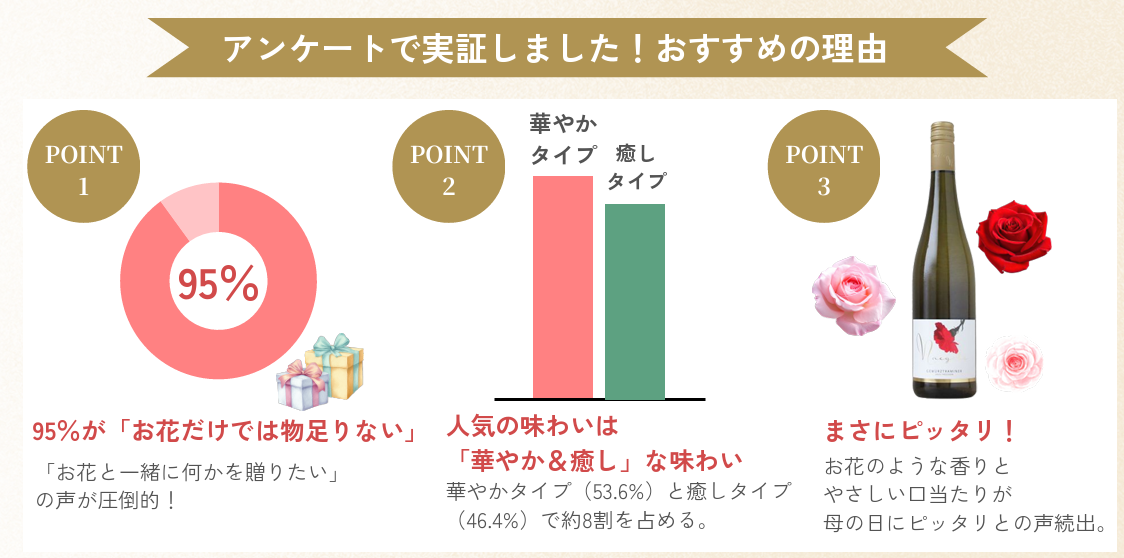 華やかさと癒しを兼ね備えたこのゲヴュルツトラミナーは、まさに母の日の贈り物にピッタリのワインです。