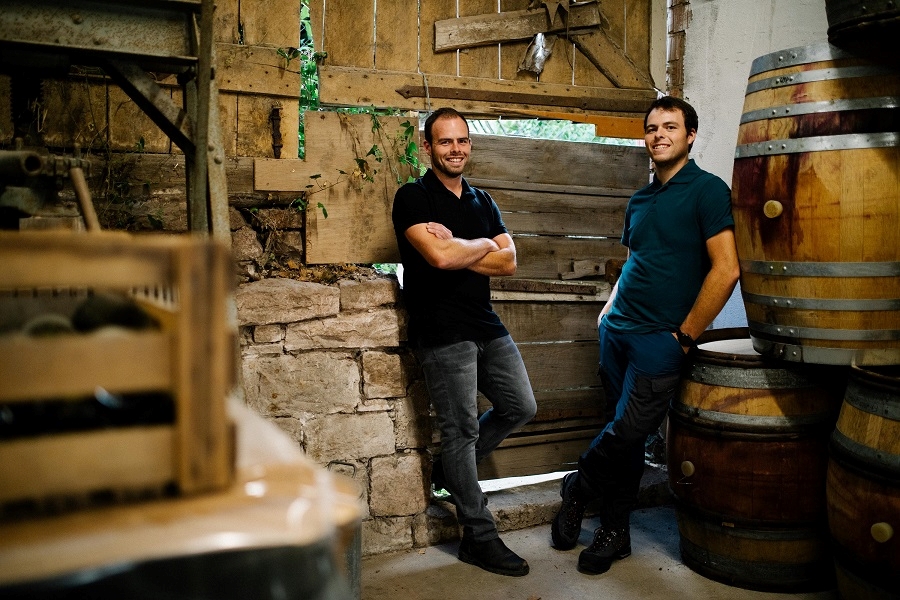 南ドイツ、バーデン地方にある「エーレンバッハ醸造所」(写真左フローリアン・エーレンバッハさん、写真右は弟のフィリップ・エーレンバッハさん)。2020年に設立されたばかりの新進気鋭の生産者です。ドイツで最も影響力のある評価誌VINUM(ヴィヌム)でバーデン地方を代表するライジングスター賞を受賞。アイヒェルマンという評価誌でも3つ星評価を獲得。バーデンの最北位置するタウバーフランケンに醸造所を構え、シュペートブルグンダー(ピノ・ノワール)、シュヴァルツリースリング(ムニエ)、シャルドネ、ミュラートゥルガウなどを生産しており、その中でも地域伝統品種であるシュヴァルツリースリング(ムニエ)は上質なピノ・ノワールと全く遜色がないといえるほどスケール感があります。彼らの情熱と手間暇惜しまず栽培されたぶどうは、ドイツトップのゼクトの生産者から求められるほどの品質を誇ります。